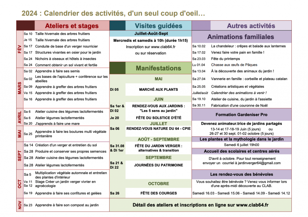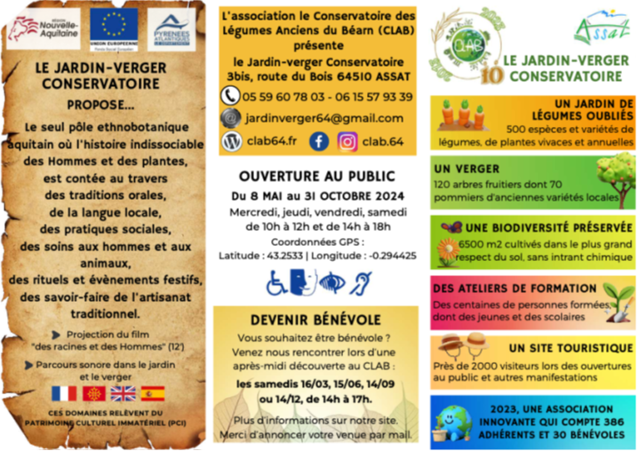 Le Conservatoire des Légumes Anciens du Béarn (CLAB) exploite un verger conservatoire ouvert au public qui soutient plusieurs activités clés. Il s’agit notamment de programmes de réinsertion professionnelle et sociale en collaboration avec des organisations partenaires, d’ateliers éducatifs pour le grand public, de la formation des jeunes et de la promotion de méthodes de culture conformes aux principes de la transition écologique.