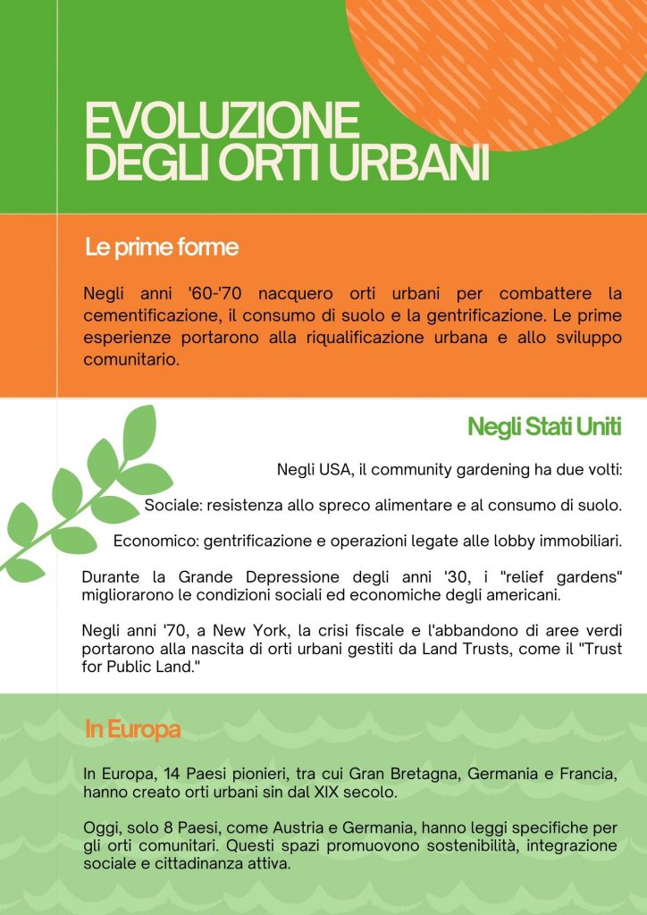 Le prime testimonianze di giardinaggio urbano e di coltivazione della città intese come gestione pubblica e collettiva risalgono alle esperienze americane degli anni ’60 e ’70. Gruppi di persone di diverse estrazioni sociali si unirono per contrastare le speculazioni edilizie neoliberiste, privatizzazioni, cementificazioni di aree verdi, consumo di suolo e gentrificazione. Le prime mobilitazioni per la riqualificazione urbana “dal basso” portarono alla creazione di orti urbani. In Inghilterra, USA, Canada e Francia, furono condotte le prime ricerche sociali sugli orti urbani nel contesto dello sviluppo comunitario, evidenziando un forte impegno civico per la qualità della vita e la sostenibilità ambientale.