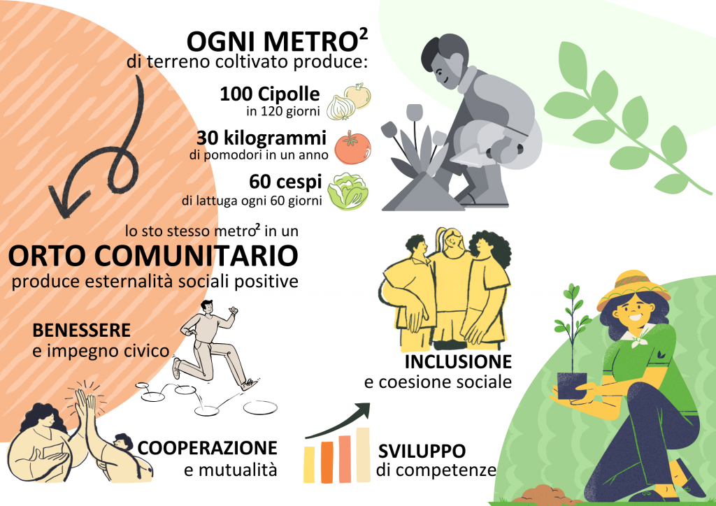 “Un solo metro quadrato di terreno può produrre 30 kg di pomodori all’anno, 100 cipolle in 120 giorni o 36 cespi di lattuga ogni 60 giorni” (Università di Oxford). Quello stesso metro quadrato di terra, in un orto urbano comunitario, può contemporaneamente generare esternalità sociali positive: sviluppo di competenze, mutualità, cooperazione, inclusione, coesione sociale, benessere e impegno civico. Questa considerazione permette di affermare che ciò che conta in queste realtà è la densità sociale di ogni kg prodotto, facendo pendere la bilancia a favore di questi progetti socialmente rilevanti. Sono frutti della terra e semi per la società.